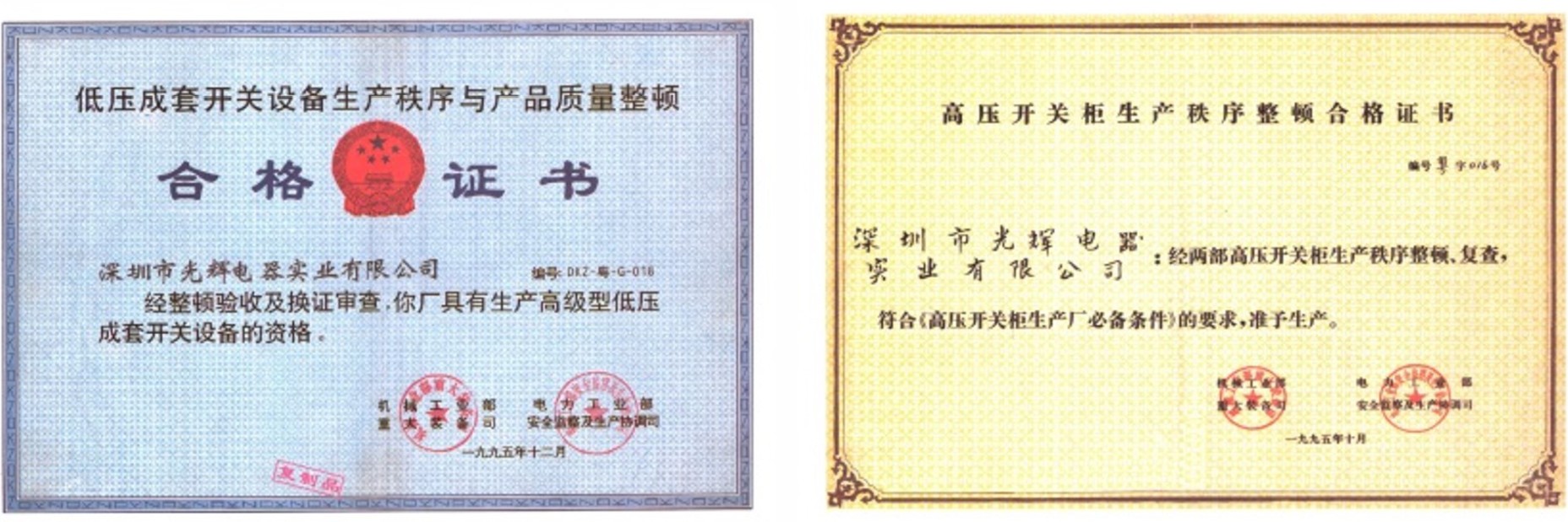 機(jī)械工業(yè)部和電力工業(yè)部聯(lián)合審查通過(guò)并頒發(fā)“兩部紅證”,成為廣東省12家合格單位之一,是最早的行業(yè)許可證。