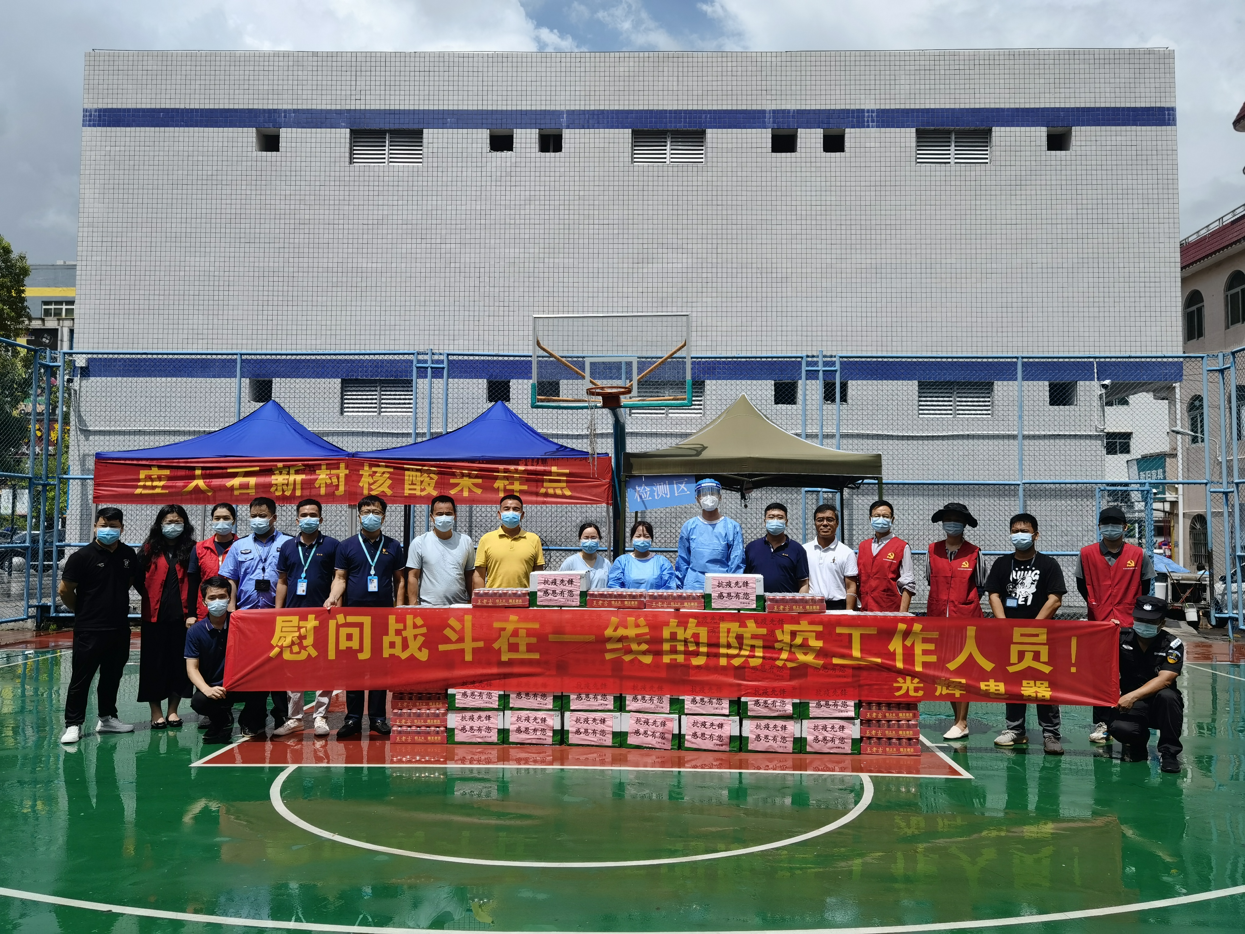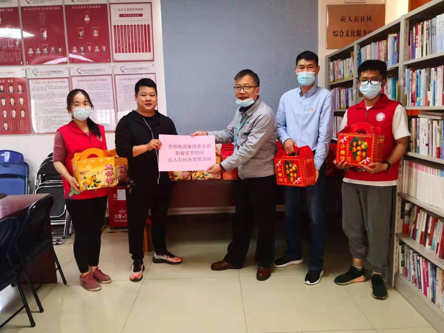 2021年新春佳節之際,為表達對疫情防控一線的社區黨員,光輝電器集團黨支部在應人石社區進行慰問,向堅守在工作站的醫護人員、社區工作者和黨員以及志愿者等一線疫情防控人員送上水果等慰問品。