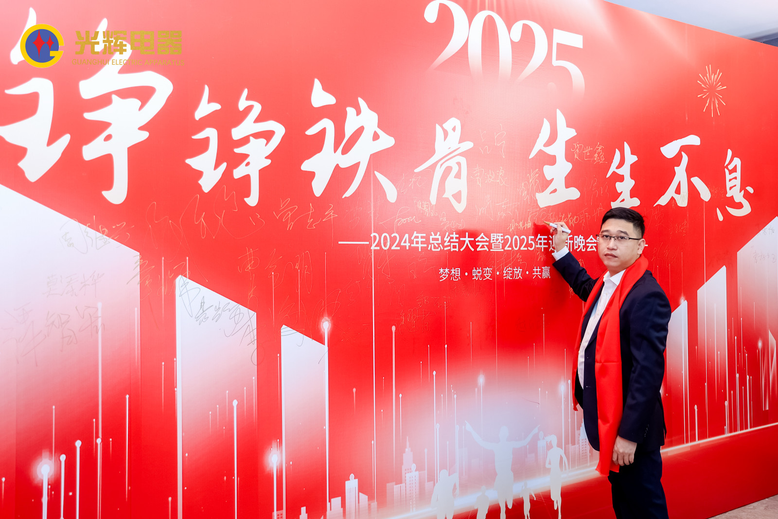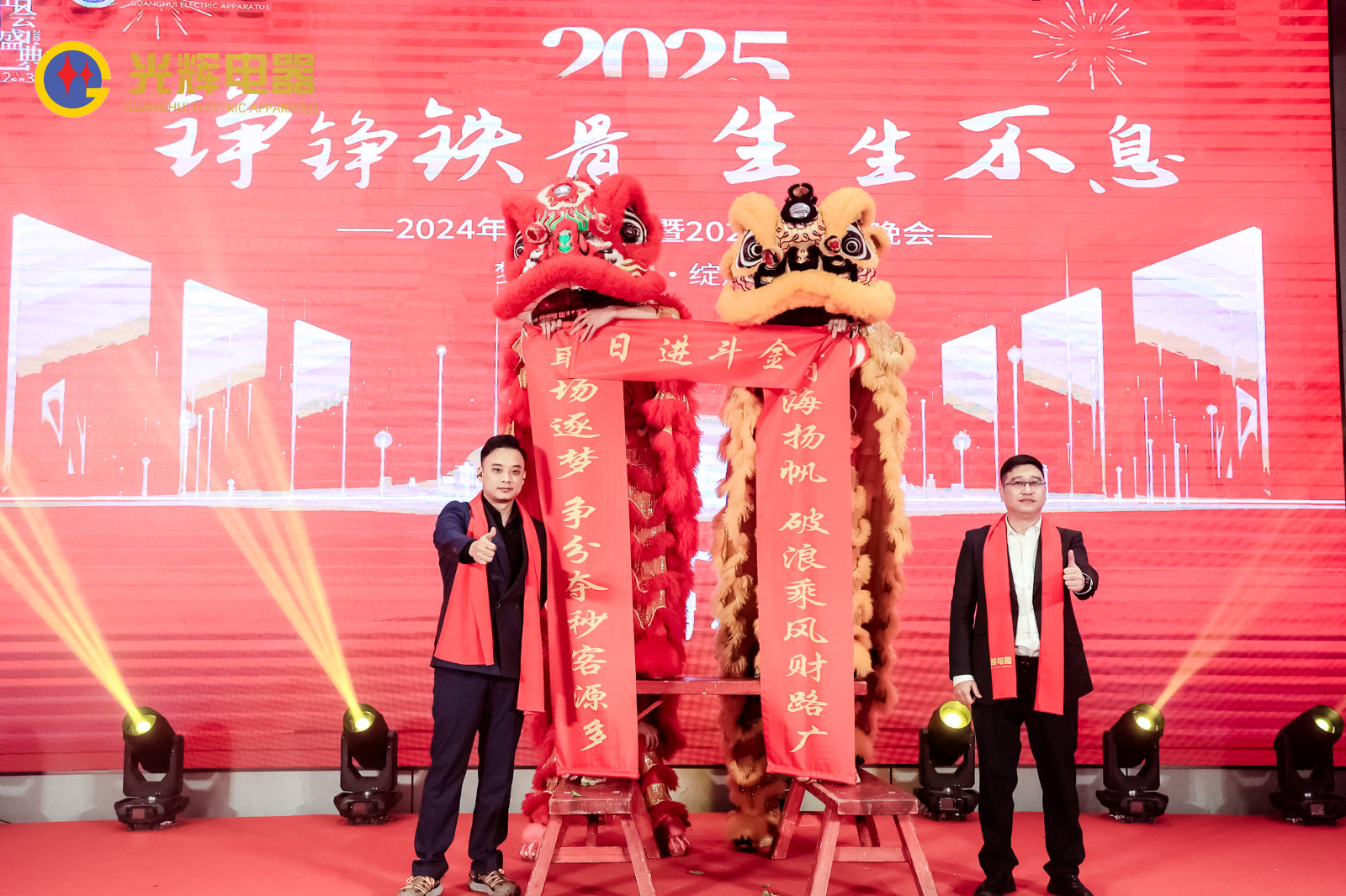 年會伊始,光輝電器董事長蔡宗光先生慷慨激昂的致辭,執行董事孫偉先生對2025年公司發展做出了戰略規劃;總經理賀未先生對2024的工作內容進行總結,對2025的工作進行全面部署;公司副總經理兼營銷總經理沈文杰先生對營銷中心工作進行總結以及部署。各位領導紛紛講話,號召光輝人人凝心聚力,共贏未來!